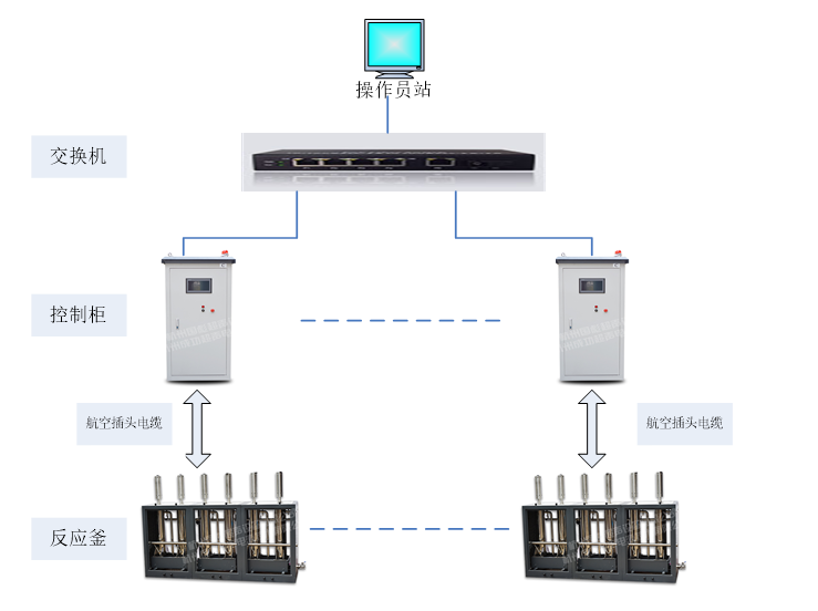 系统结构图如图1所示,每套控制����� �������Ƴ������������ �������Ƴ������������ �������Ƴ������������ �������Ƴ�������柜内安装有6台超声波发生器,并驱动6只超声振动主机;控制柜正面放置10寸以上触摸屏,可对放置����� �������Ƴ������������ �������Ƴ������������ �������Ƴ������������ �������Ƴ�������于其中的6台超声发生器进行����� �������Ƴ������������ �������Ƴ������������ �������Ƴ������������ �������Ƴ�������单独参数设置,如主机功率、系����� �������Ƴ������������ �������Ƴ������������ �������Ƴ������������ �������Ƴ�������统参数设置等。在电气控制柜面板����� �������Ƴ������������ �������Ƴ������������ �������Ƴ������������ �������Ƴ������安装有总运行按钮(带指示灯)、急停按钮和报警指����� �������Ƴ������������ �������Ƴ������������ �������Ƴ������������ �������Ƴ�������示灯,整体系统具有振子异常报警、电源异常报警����� �������Ƴ������������ �������Ƴ������������ �������Ƴ����������� �������Ƴ�������、机柜温度异常报警,振子����� �������Ƴ������������ �������Ƴ������������ �������Ƴ������������ �������Ƴ�������工具头磨损报警等。超声波振动主机����� �������Ƴ������������ �������Ƴ������������ �������Ƴ������������ �������Ƴ�������纵向放置于管道式反应釜内,反应釜����� �������Ƴ������������ �������Ƴ������������ �������Ƴ������������ �������Ƴ�������支架及外罩采用不锈钢制作、内部贴5cm厚的隔音棉����� �������Ƴ������������ �������Ƴ������������ �������Ƴ����������� �������Ƴ�������,降低超声空化产生的噪音。该系����� �������Ƴ������������ �������Ƴ������������ �������Ƴ������������ �������Ƴ�������统具有远程控制功能,操作员站(电脑端)可通过交换����� �������Ƴ����������� �������Ƴ������������ �������Ƴ������������ �������Ƴ�������机远程实现对每台超声主机的启停及����� �������Ƴ����������� �������Ƴ������������ �������Ƴ������������ �������Ƴ�������参数设置等功能