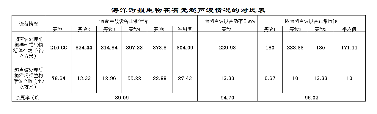 • 超声波设备正常运行后,可以杀����� �������Ƴ����������� �������Ƴ������������ �������Ƴ������������ �������Ƴ�������死海生物,超声波设备对海生物的杀死����� �������Ƴ������������ �������Ƴ������������ �������Ƴ����������� �������Ƴ�������率为99.09%;增加对比表格,有超声和没有超声进行对比。
